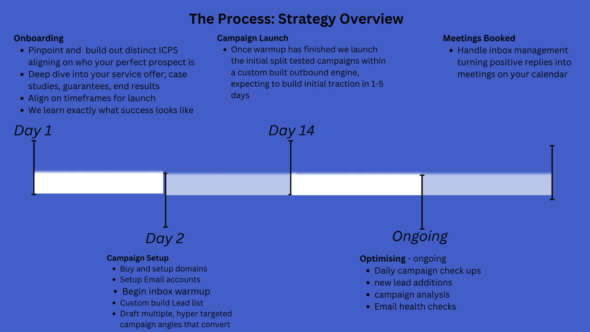 We discuss exactly what the goals are for the business, and who exactly the ideal clients are that move the business towards and beyond those goals.I build the lists, segment personas and build the campaigns to engage only these ideal prospects, whilst testing every variable that could impact success rates.